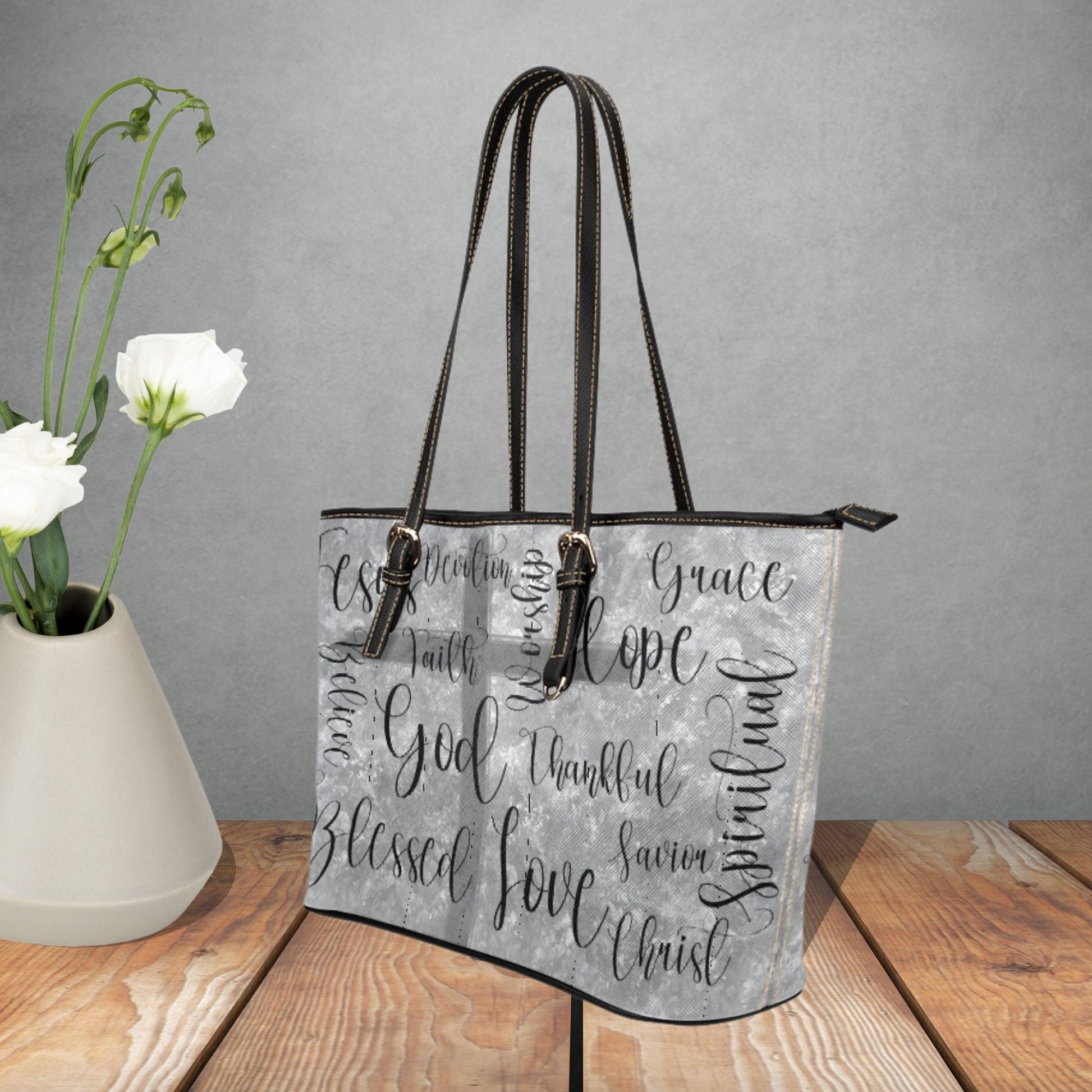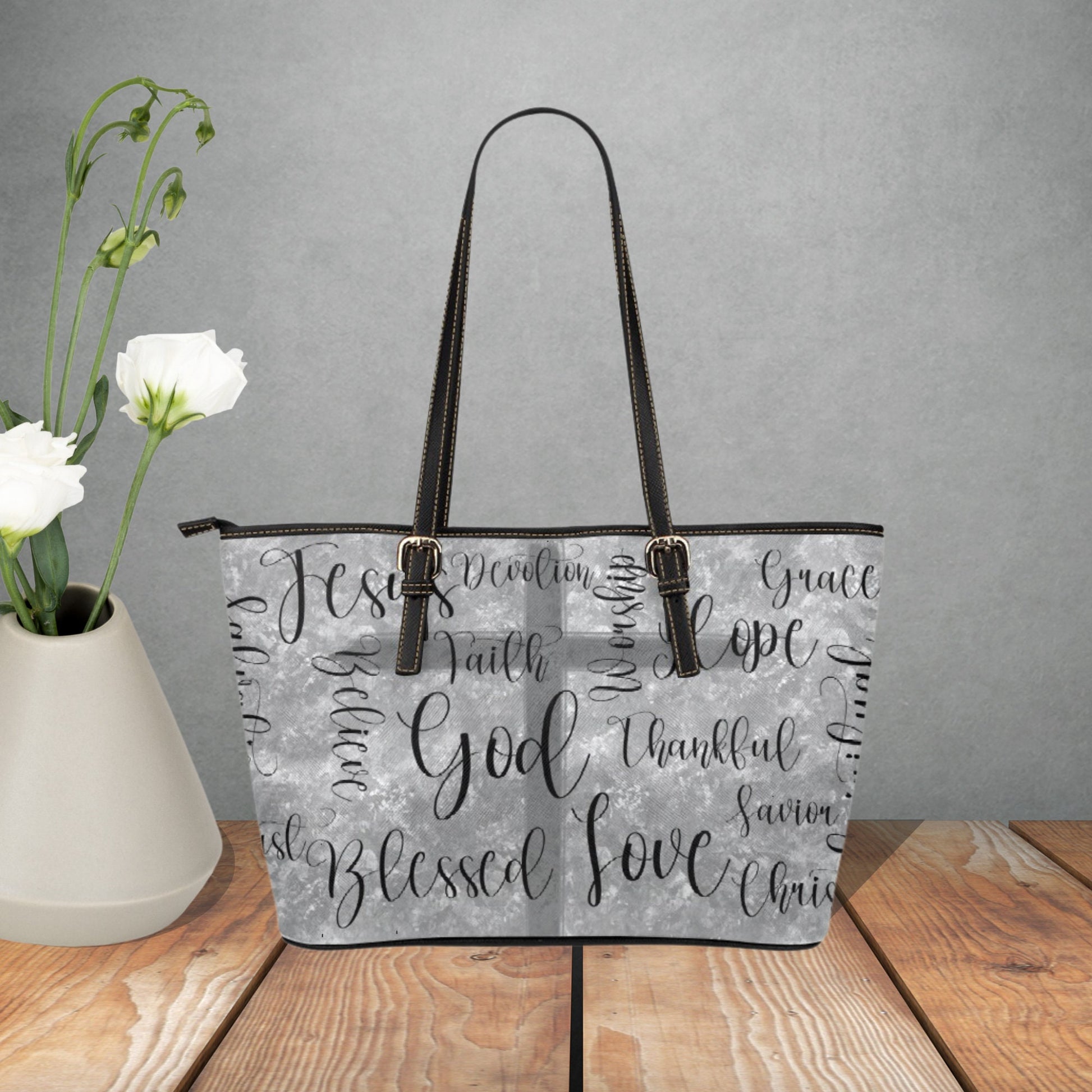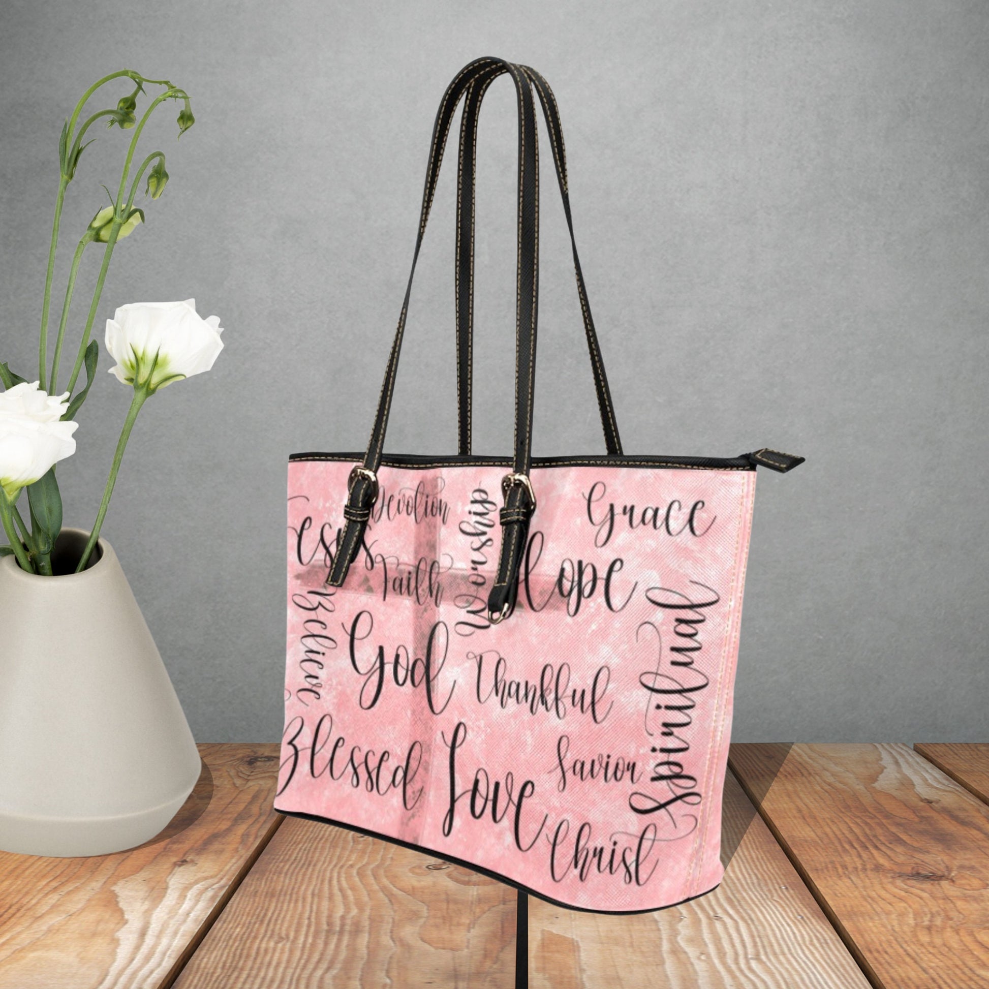 Pink, Grey, or Black/White handbag with Inspirational words of God printed on both sides. Large handbag with a washed and faded background design couple with religious words Faith, Thankful, Blessed, Devotion, Spiritual, Believe, Love, God and Jesus. Use this Christian tote to remind you of your Christian beliefs and the strength of God, Perfect purse to make that bold and beautiful statement and large enough to carry most all necessary personal belongings.