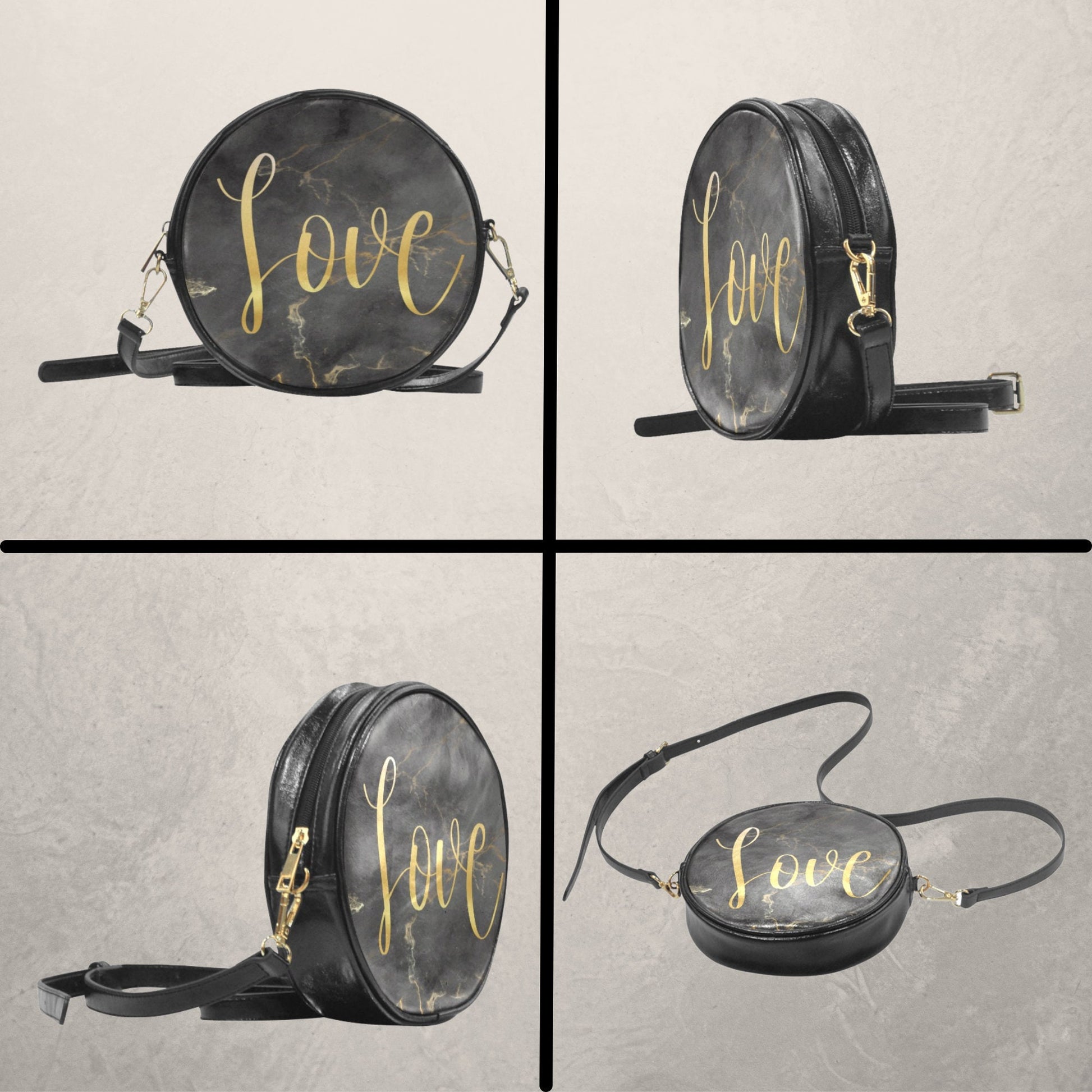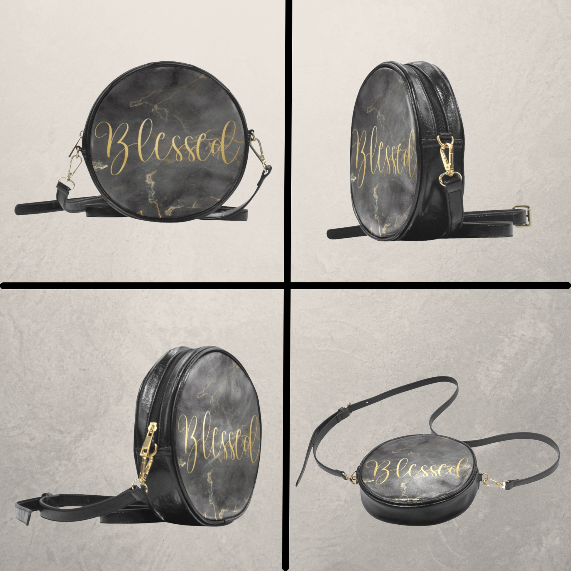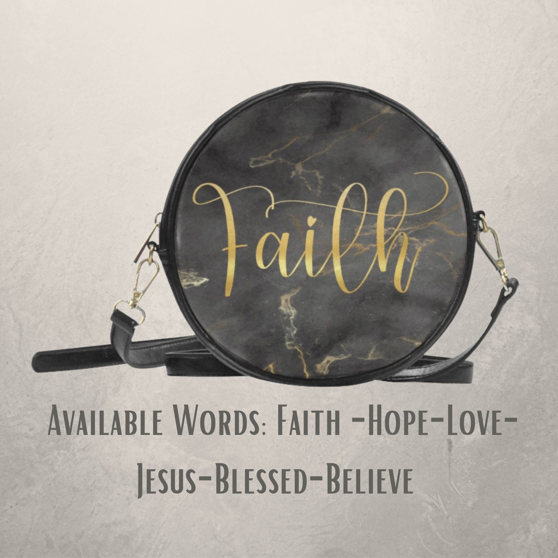 Stylish round messenger sling bag with Christian Inspirational Words on a Black and Gold Marble background design. Sling bag is made with high-grade Faux Leather printed on the front with available choice of Christian themed words. This messenger sling bag it is sure to display your Religious beliefs year ‘round.