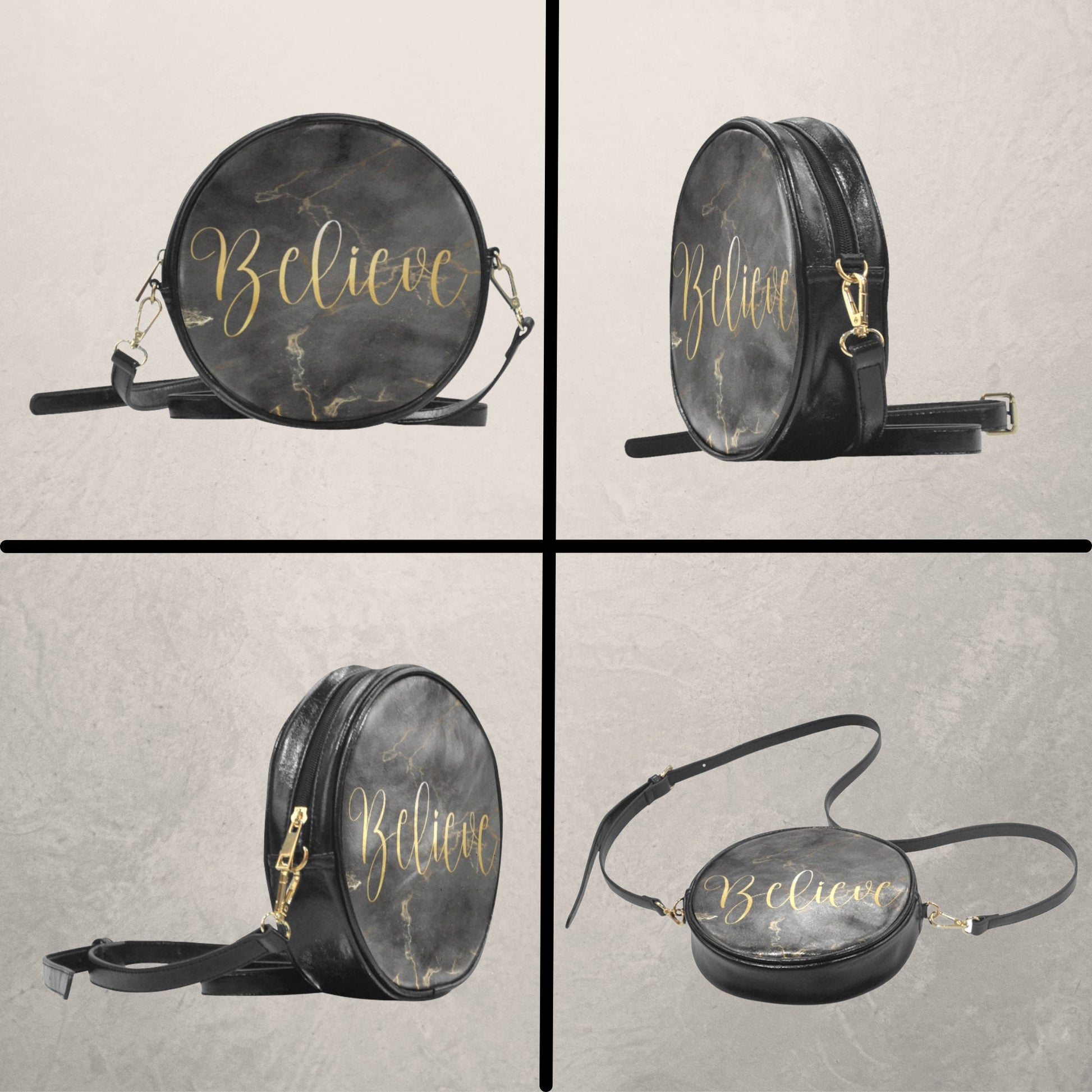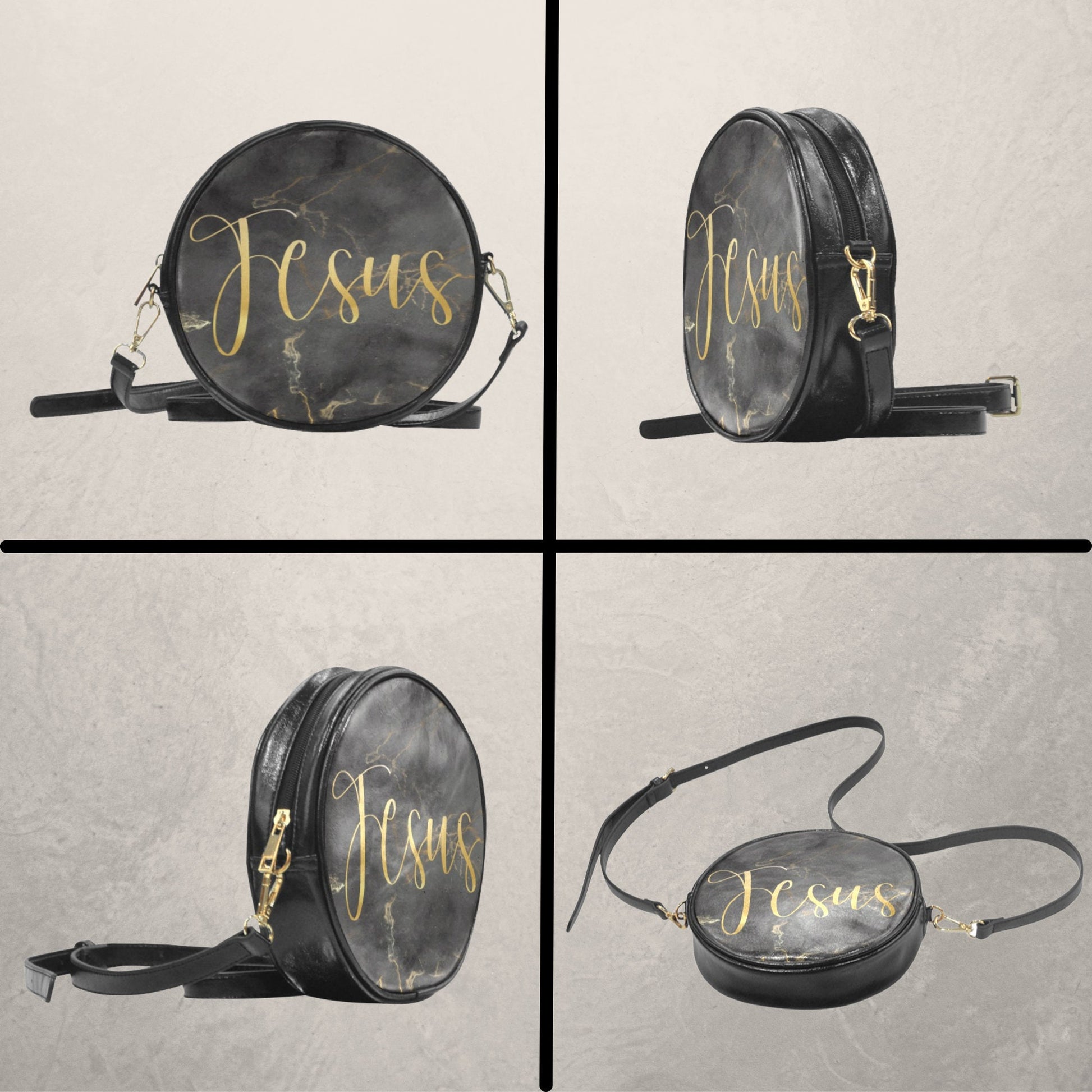 Christian Inspirational Words Round Crossbody Sling Bag, Jesus Bag, Faith crossbody bag with Black and Gold, Religious PU Leather handbag