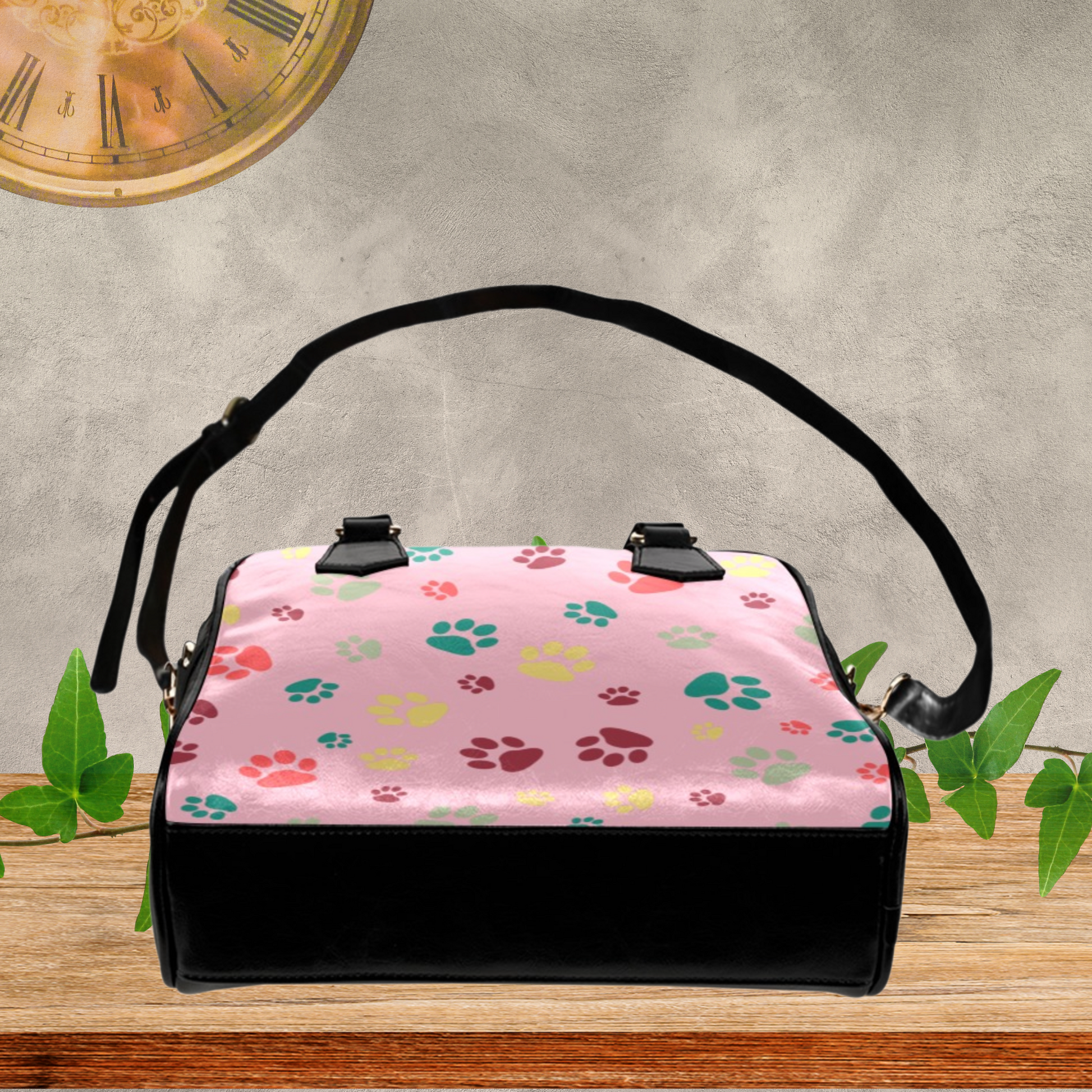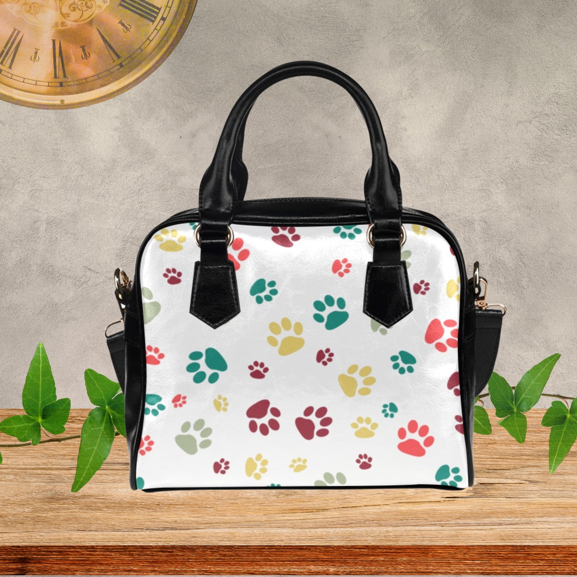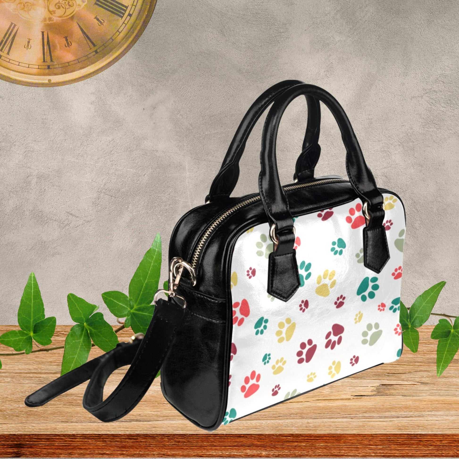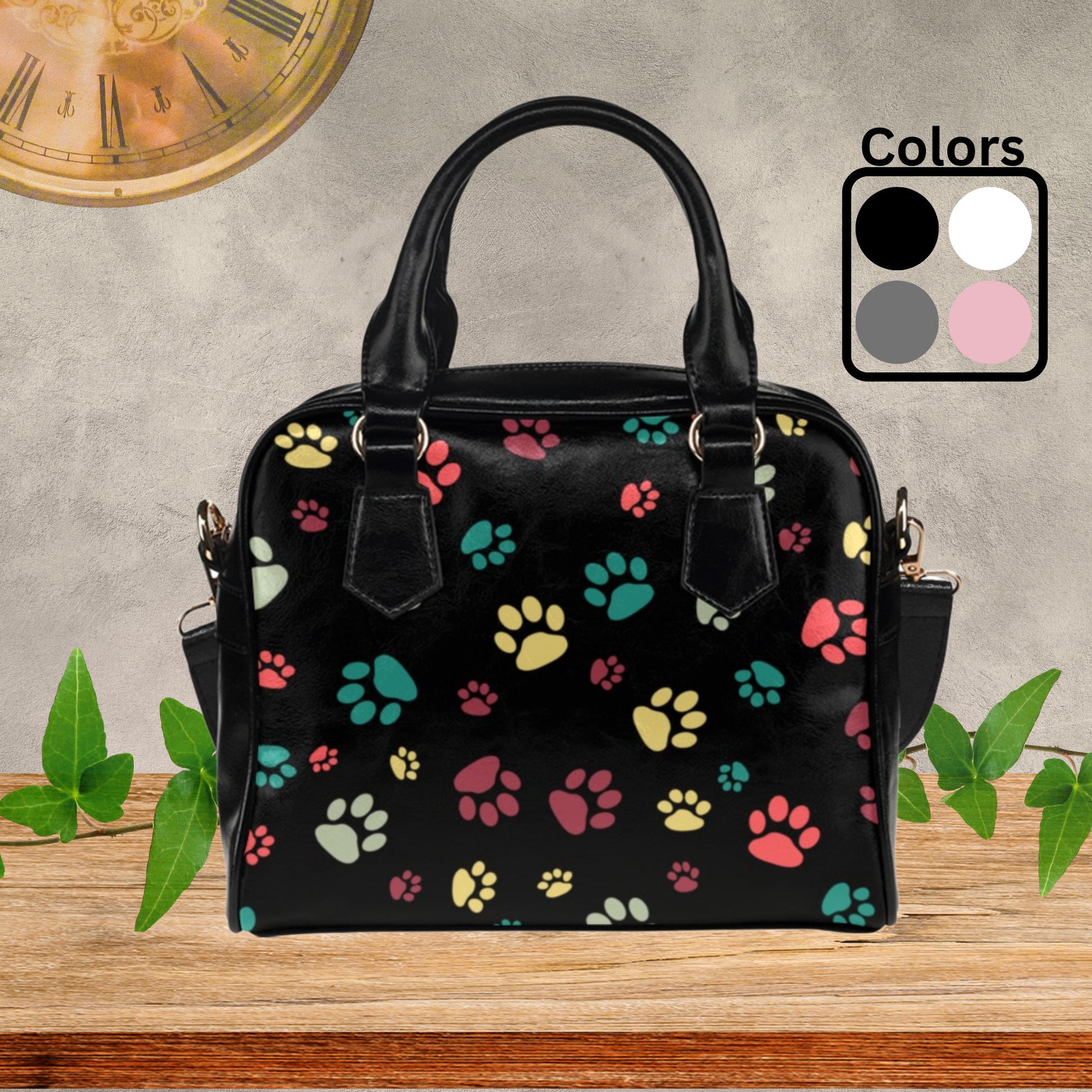 Black PU leather shoulder handbag featuring dog paw prints design in neutral colors. This Faux leather purse has a paw prints on both sides, available in Pink, Gray, White, and Black and includes plenty of room inside for personal items.