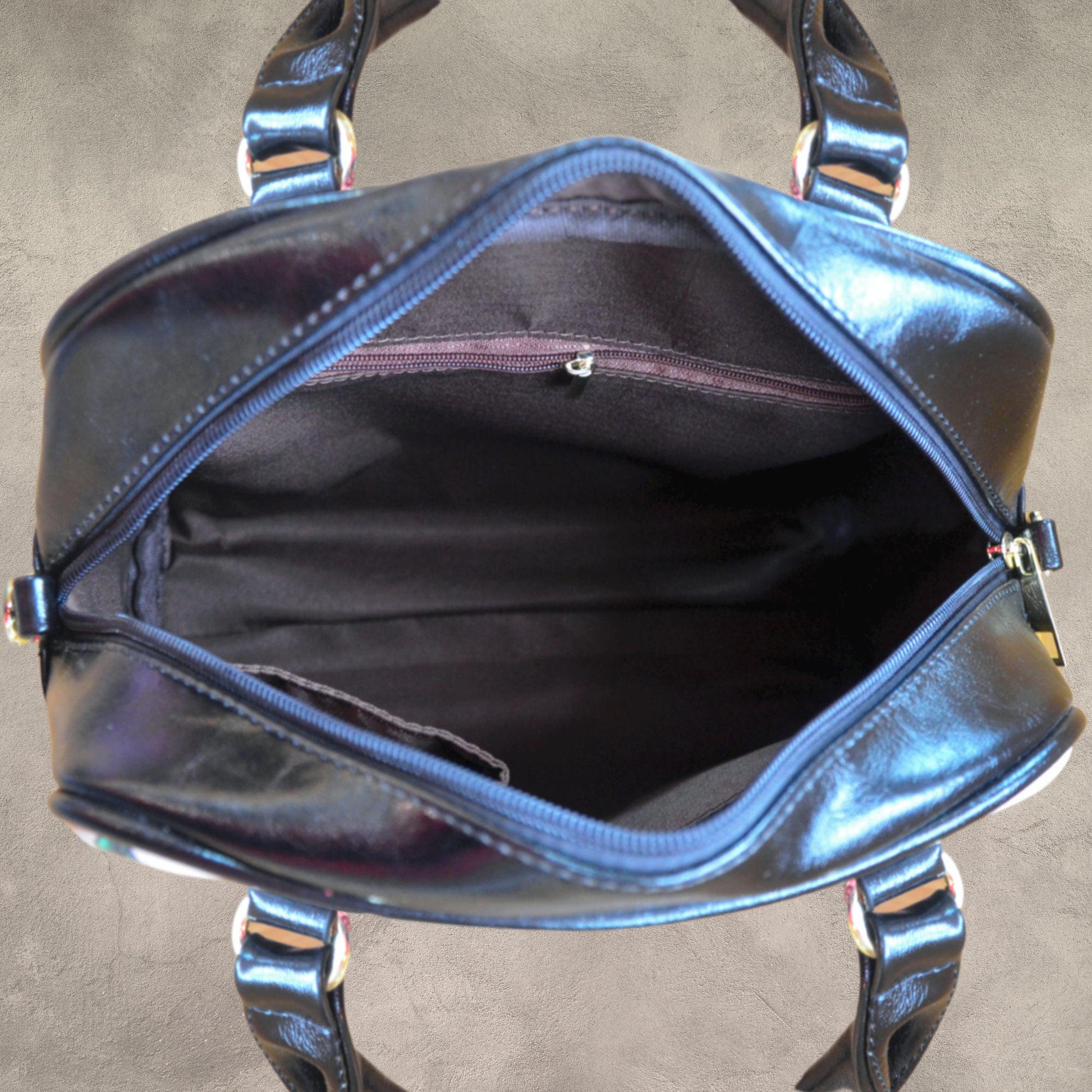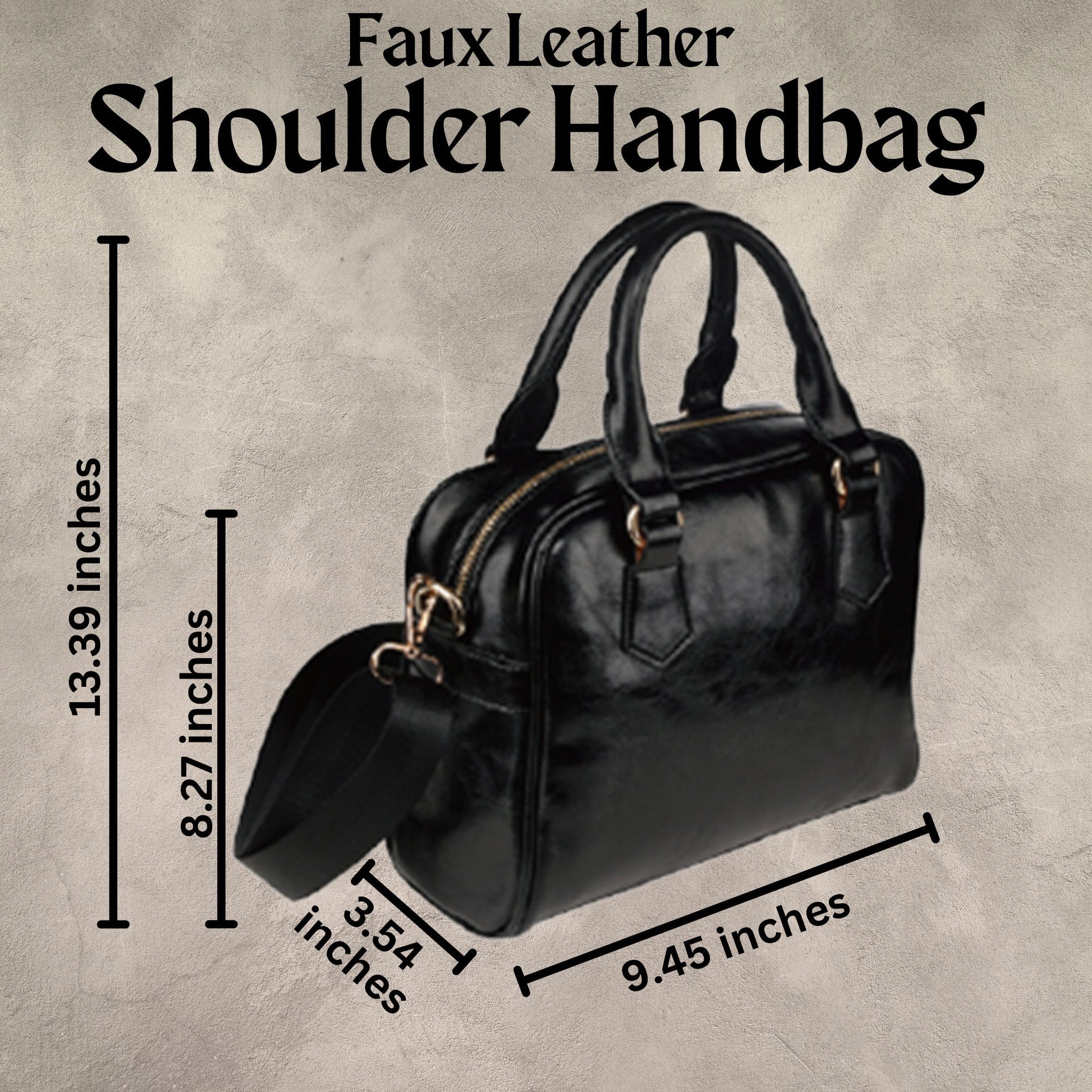 Fashionable black PU leather shoulder handbag featuring a pattern of red and black colored hearts. This Faux leather purse has a beautiful heart pattern on both sides and plenty of room inside for personal items.