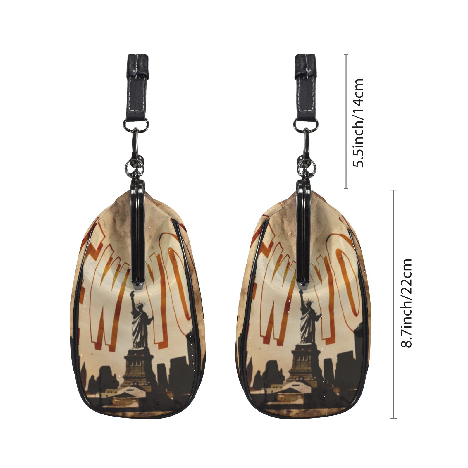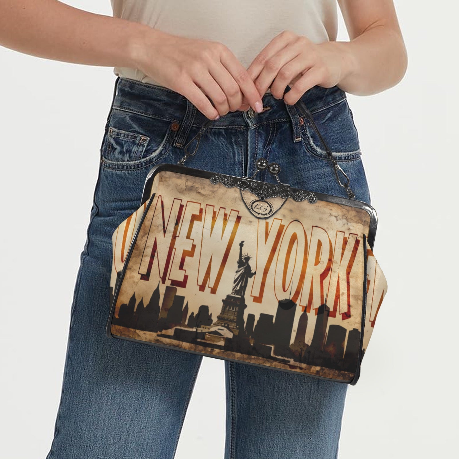 Introducing our New York City skyline featuring the Statue of Liberty Crossbody Handbag. A Unique vintage style handbag with a beautiful silhouette of Lady Liberty and the city behind her. Printed on all four sides on a Vintage background, proudly display New York City skyline as you keep all your personal items organized. This versatile crossbody purse has 3 internal pockets, a comfortable carry handle and removable shoulder strap. Great handbag to give as a gift as an inspiration for those who want to go to New York, and those who have been and love the memories! Top opening has a metal frame that opens wide for easy access and closes and latches with metal Kisslock clasps