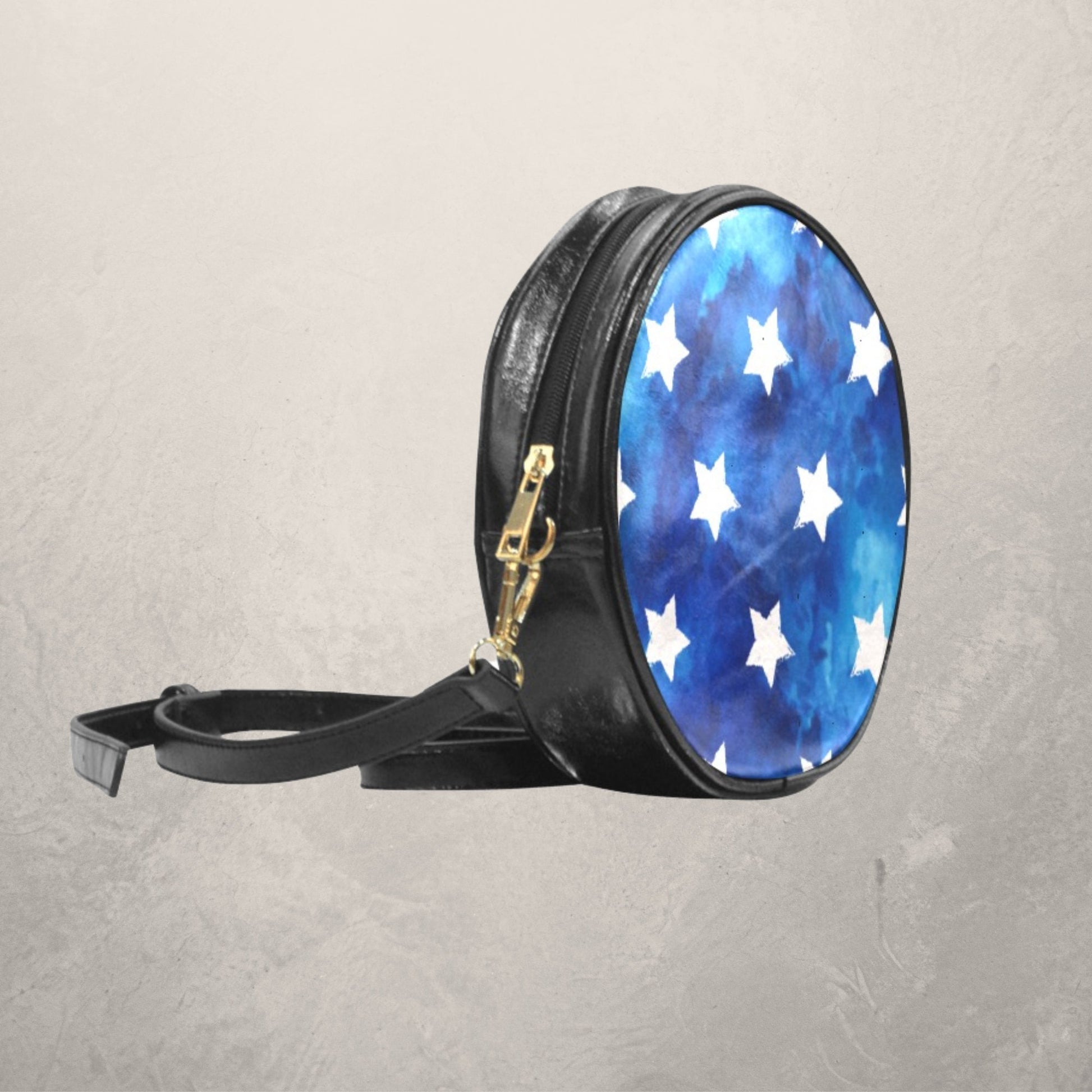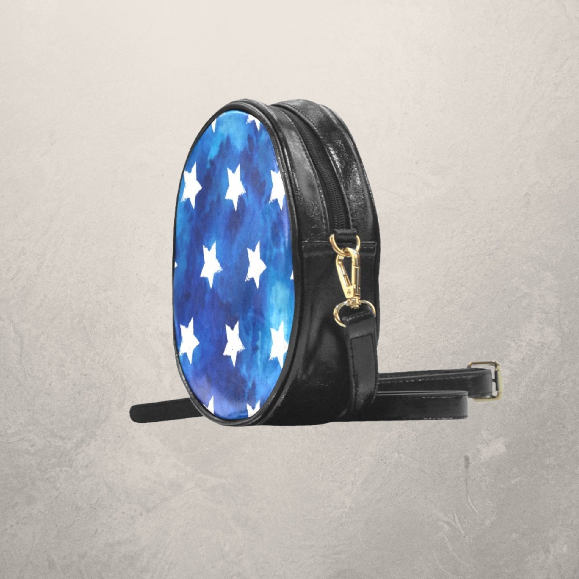 Women’s Blue Watercolor and White Stars Round Crossbody Sling Bag, Round PU Leather Sling Bag with Stars, Fourth of July Blue Shoulder bag